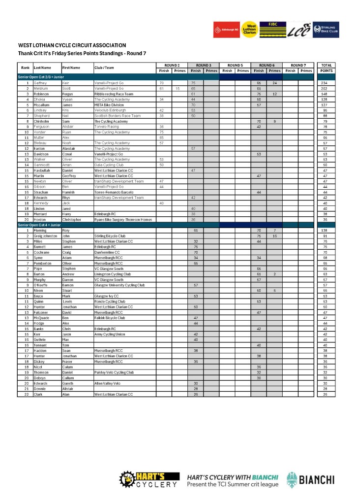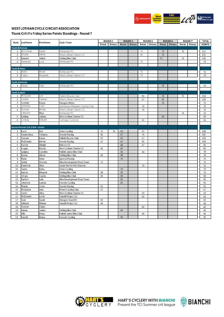 Hamish MacLean (v50), James Mccallum (v40), Lee McQueen (Youth A boys), Sarah McCormac (Youth B Girls extend their leads in the TCI Friday league after round 7.