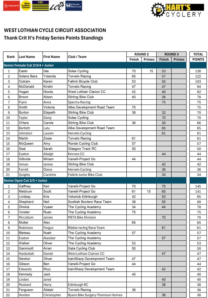 After round 1 was cancelled, round 2, organised by Edinburgh Road Club was a terrific success, results published below, Many thanks to organiser Steve Canney and all the volunteers Results also published on the British Cycling Website